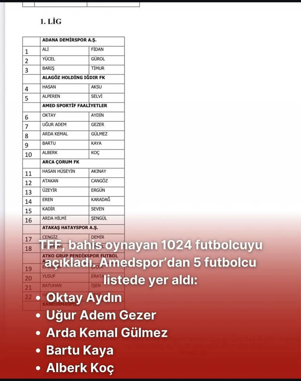 Listede Amedspor'dan kaptan Uğur Adem Gezer, Oktay Aydın, Arda Kemal Gülmez, Bartu Kaya, Alberk Koç da yer aldı. Buna göre ismi açıklanan futbolcular, cezalar belli olana kadar forma giyemeyecek.