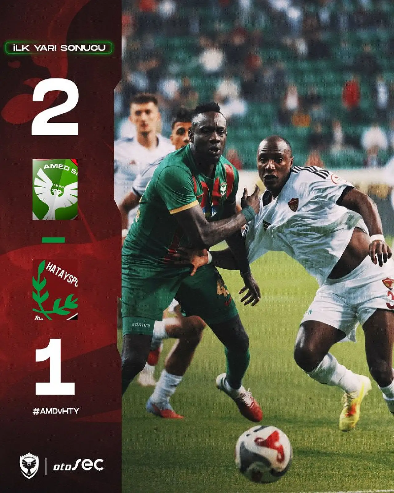 Trendyol 1. Lig 13. hafta maçında Amedspor, Hatayspor karşısında ilk yarıyı 2-1 önde tamamladı. Senegalli golcü Mbaye Diagne, attığı iki golle tribünleri ayağa kaldırdı.