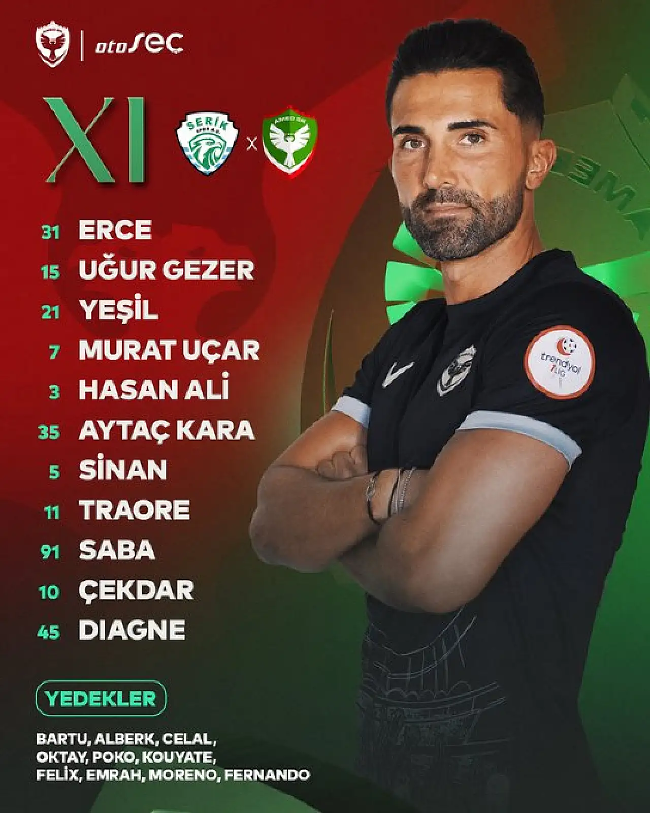 Amedspor: Erce, Murat, Mehmet Yeşil, Uğur Gezer, Hasan Ali, Aytaç, Sinan, Dia Saba, Çekdar, Traore, Diagne